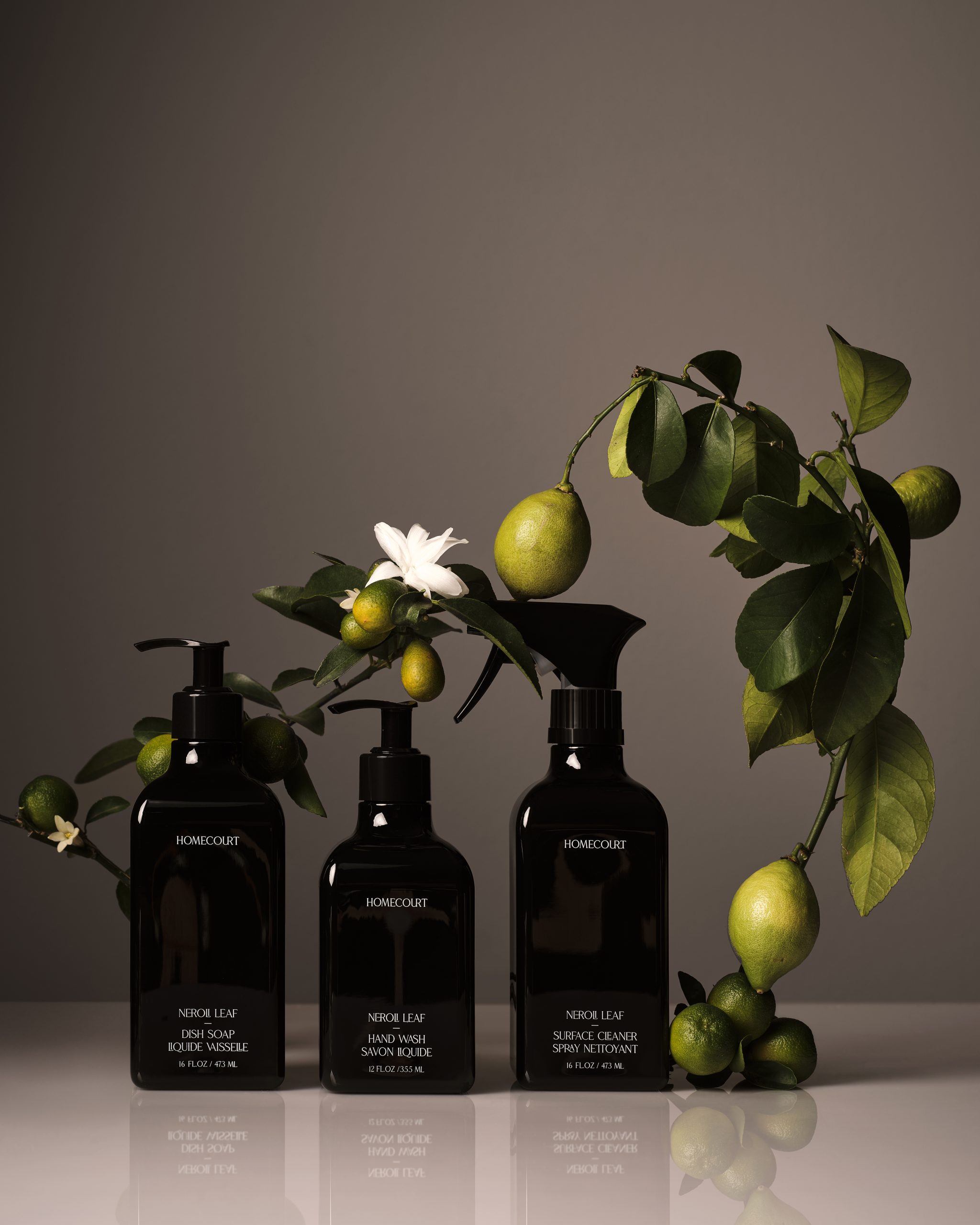 Homecourt features fine fragrances, clean formulas and sustainable design. Designed and developed by Courtney Cox with skincare chemists to create non-toxic, yet effective formulas for skin care and cleaning.